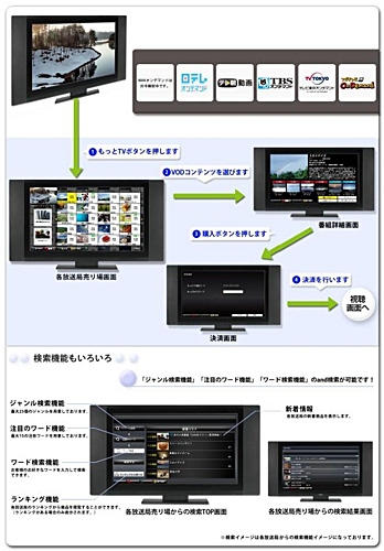 今春以降に発売するインターネット接続対応テレビは、「もっとTV」を利用できる。また、スマートフォンやタブレット端末への展開も検討中。リモコンの専用ボタンを押すだけでVOD画面(売り場)への移動ができ、地上波放送を子画面に残した状態でVODコンテンツを選択できる。移動先のVOD画面は放送中の番組に連動しているので、視聴中の番組に関連するVODコンテンツを簡単に見つけることができる。
