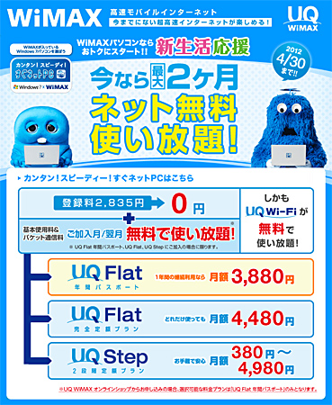 共同プロモーションの一環として、2月1日~4月30日、WiMAX搭載PCからWiMAX統合ポータルサイトにアクセスし、「UQ Flat年間パスポート」「UQ Flat」または「UQ Step」で新規契約すると、通常2835円のWiMAX登録料が無料になるほか、通信料が最大2か月間無料になるキャンペーン「今なら最大2ヶ月ネット無料使い放題!」を実施する。