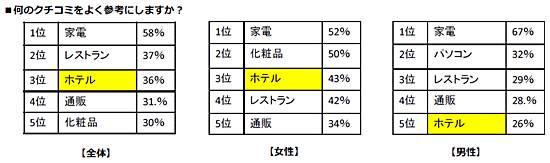 調査は、20~50歳の男女計400名を対象にインターネットで実施。インターネットの口コミを「よく見る」「たまに見る」と答えた人が参考にしているモノやサービスを調査した結果、男性の1位は家電で67%、2位はPCで32%、3位はレストランで29%だった。女性の1位は家電で52%、2位は化粧品で50%、3位はホテルで43%だった。全体では、1位が家電で58%、2位がレストランで37%、3位がホテルで36%だった。