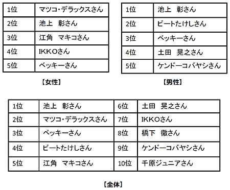 そのほか、インターネットの口コミで信用できる著名人として人気が高かったのは、男性では、1位が池上彰さん、2位がビートたけしさん、3位がベッキーさんだった。女性では、1位がマツコ・デラックスさん、2位が池上彰さん、3位が江角マキコさんだった。男女全体では、1位が池上彰さん、2位がマツコ・デラックスさん、3位がベッキーさんとなった。