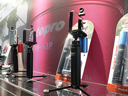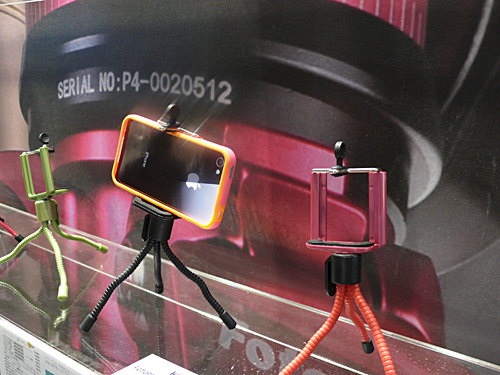 三脚では、スマートフォン用のポケット三脚に力を入れているという。コンパクトに収納できるモデル、脚を自由に曲げることができるモデルなどを展示。