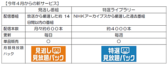 コンテンツは、過去の名作番組「特選ライブラリー」を見直す。現在、「特選ライブラリー」のコンテンツは、配信開始から約3か月後に「特選見放題パック」に加えているが、4月からは、配信開始と同時に見られるようになる。これによって、「特選見放題パック」と、放送直後の番組とニュース番組が見放題の「見逃し見放題パック」の両方に加入すると、NHKオンデマンドで配信している4000本以上の全コンテンツが見放題になる。