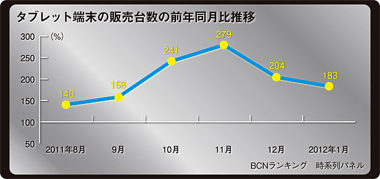 タブレット端末の販売台数が大幅に増えている。とくに、昨年の年末商戦で顕著にあらわれた。BCNランキングによれば、10月が前年同月比241%、11月279%、12月204%で推移。今年1月に入ってからも、183%と伸びている。
