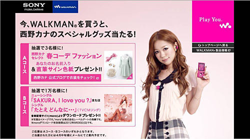 Bコースは、ソニーのホームページで製品登録したユーザーのなかから抽選で1万人に、3月7日発売の西野さんの新曲「SAKURA, I love you?」またはウォークマンのCMソング「たとえどんなに…」が当たる。当選者は音楽配信サイト「mora」からダウンロードできる。