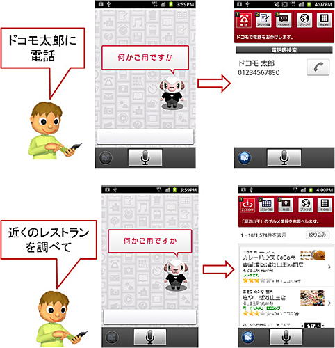 ネットワーククラウドを活用したインターフェース機能で、調べたいことや使いたい機能などをスマートフォンに向かって話しかけると、言葉と言葉の組み合わせから意図を解釈し、適したサービスや機能を判断して回答を画面に表示する。例えば、「○△さんに電話する」と話しかけた場合は、電話帳から「○△」を検索し、ダイヤル画面を表示する。