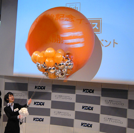 風船を割って「auスマートパス」開始を祝った