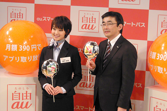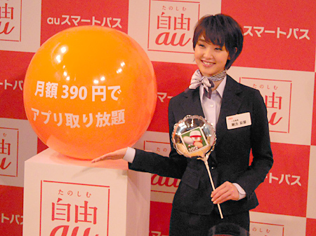 KDDI、月額390円でアプリ使い放題の「auスマートパス」スタート、剛力彩芽さんが制服姿で登場