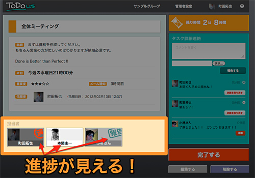 さらに、メンバーのタスク進捗状況がひと目でわかるよう、なじみのある「済」や「報告済」など、わかりやすい表示を採用。見落としのないタスク管理を実現する。また、それぞれのタスクにコミュニケーションシートを備え、「ホウレンソウ」をより簡単に実施することができる。このほか、「ありがとう」ボタンを押すことで簡単に感謝の気持ちを伝えられる「みんなの連絡帳」を画面右側に搭載する。