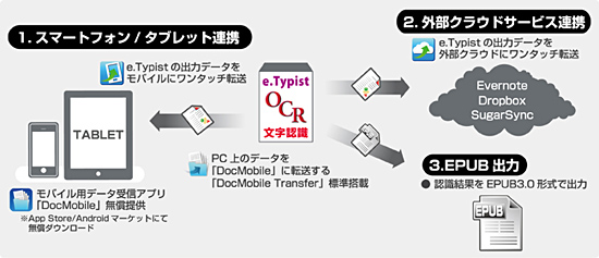 また、スマートフォンやタブレット端末で「e.Typist」やPCから転送したファイルを受信して管理するアプリ「DocMobile」と、PC上のデータを「DocMobile」に転送するアプリ「DocMobile Transfer」を無償で提供する。