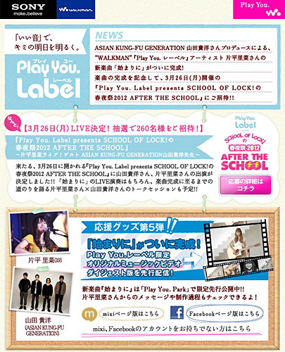 「始まりに」の完成を記念し、3月26日にマウントレーニアホール渋谷で開催するライブ「Play You. Label presents SCHOOL OF LOCK!の春夜祭2012 AFTER THE SCHOOL」に、抽選で130組260人を招待する。ライブでは片平里菜さんが楽曲を披露するほか、片平さんと山田さんのトークセッションなどを行う予定。応募は3月8~19日、特設サイトで受け付ける。