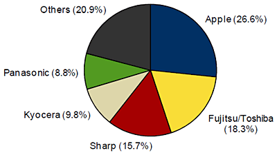 メーカー別出荷台数シェアでは、アップルが26.6%を獲得し、国内市場で初めて1位となった。新型iPhone「iPhone 4S」をソフトバンクモバイルとKDDI(au)から発売したことで、出荷台数を伸ばした。