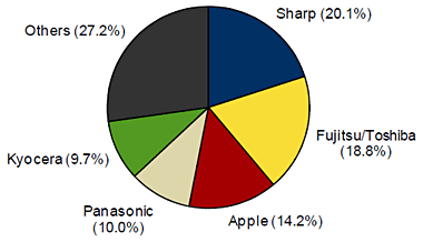 11年の年間出荷台数は、前年比5.0%増の3796万台。メーカー別シェアはシャープが20%を確保し、昨年に引き続きトップとなった。2位は、富士通東芝モバイルコミュニケーションズで18.8%。トップのシャープとの差は2ポイントたらずの僅差だった。3位は、第4四半期にトップを獲得したアップルが14.2%を獲得し、初のトップ3入りを果たした。