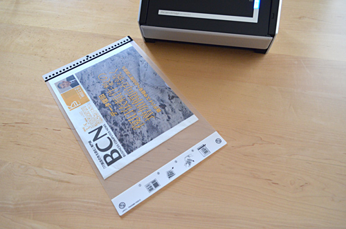 A4以上A3以下の原稿は、2つ折りにして添付のA3キャリアシートに挟んでスキャンすると、自動的に両面を読み取って1枚の画像にしてくれる