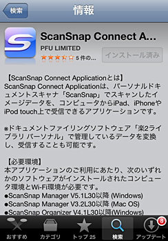 専用アプリの「ScanSnap Connect Application」は、App Storeで無償で手に入る