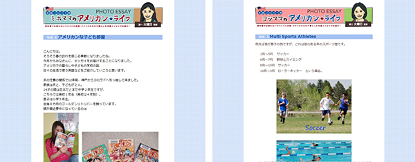 エッセイ「アメリカン☆ライフ」は、コロラド州に住む2人の日本人ママ「ミホママ(Mettais 美保)」と「ヨシママ(Wooten 喜子)」が執筆。アメリカで家庭をもち、子どもを育てるなかで起きるできごとや日常風景を、文章と写真で「日本人ママ」の視点から紹介していく。