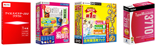 左から、トレンドマイクロ ウイルスバスター2012 クラウド 1年版(5名様)、筆まめ パーソナル編集長Ver.9(2名様)、筆まめ 筆まめVer.22 オールシーズンパック(3名様)、ダイナコムウェア DynaFont TypeMuseum 3710 TrueType for Windows(1名様)