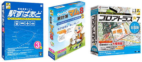 左から、ヴァル研究所 駅すぱあと(Windows)2012年3月(3名様)、テクニカルソフト てきぱき家計簿マム8(5名様)、筆まめ プロアトラスSV7 全国版(2名様)