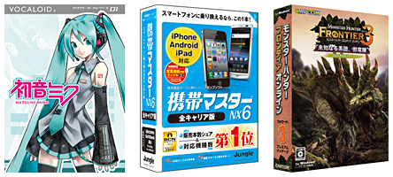 左から、クリプトン・フューチャー・メディア キャラクター・ボーカル・シリーズ01 初音ミク(2名様)、ジャングル 携帯マスターNX6 全キャリア版(5名様)、イーフロンティア モンスターハンター フロンティア オンライン フォワード3 プレミアムパッケージ(3名様)