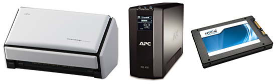 左から、PFU ScanSnap S1500 楽2ライブラリ パーソナル V5.0 セットモデル(1名様)、シュナイダーエレクトリック APC RS 400(3名様)、マイクロン ジャパン Crucial m4 128GB(1名様)