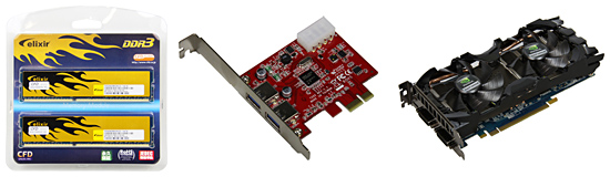 左から、シー・エフ・デー販売 CFD ELIKIR W3U1600HQ-4G(1名様)、シー・エフ・デー販売 USB3.0N4-PCIe(1名様)NVIDIA/PCI-Express x16 GF-GTX560Ti-E1GHW (1名様)