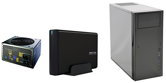 左から、シー・エフ・デー販売 ATX電源KRPW-PT600W/92+(1名様)、シー・エフ・デー販売 3.5型HDDケースGW3.5AA-SUP3/MB(1名様)、Antec SOLO II(2名様)