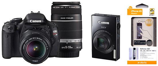 左から、キヤノン EOS Kiss X5 ダブルズームキット(1名様)、キヤノン IXY 1(ブラック)(1名様)、テレホンリース X-doria iPhone 4S用ケース Defense360 クリア(10名様)