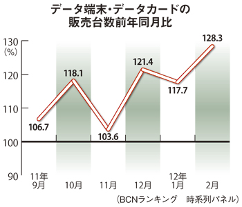 家電量販店の実売データを集計した「BCNランキング」で、データ通信端末・データ通信カードの販売台数をみると、昨年9月からこれまで毎月、前年同月を上回っている。販売がピークになる12月は121.4%、さらに今年2月には128.3%に達した。