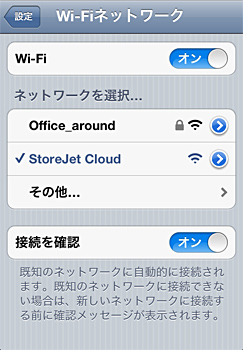 次に接続するiPhone/iPadの設定をする。「App Store」で無料の専用アプリ「StoreJet Cloud」をダウンロードして、iPhone/iPadにインストールする。「StoreJet Cloud」の電源を入れると、本体上部のWi-Fiマークが点灯するので、接続したいiPhone/iPadの設定メニューから「Wi-Fi」、「StoreJet Cloud」を選択して接続は完了だ。2回目以降は、ほかに接続しているWi-Fi回線がない限り、自動で接続する。Wi-Fi接続が完了したら、さっそくアプリを起動しよう。自動的に「StoreJet Cloud」内に保存したファイル、フォルダの一覧を表示する。