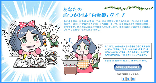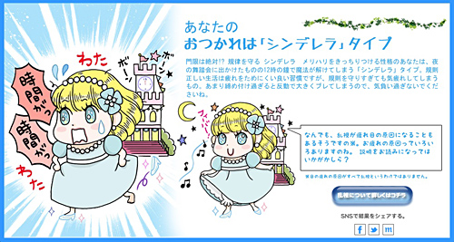 SNSのアクションの傾向をもとに、白雪姫、シンデレラ、かぐや姫、人魚姫、眠り姫、織姫、おやゆび姫の7人のお姫様タイプに分類した診断結果から、ユーザーの疲れに気づいてもらうコンテンツ。