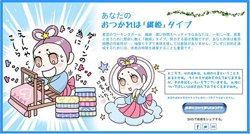 スペシャルサイトにアクセスし、Twitter、Facebookのアカウントからログインすると、過去の投稿数や投稿時間などから傾向を自動的に分析。SNSで何かとアクション数が多い人は「白雪姫」、夜0時までの間にアクティブになる人は「シンデレラ」、異性からのコメントや「いいね!」が多い人、フォロワーの数がフォロー数よりも多い“モテ体質”の人は「かぐや姫」、投稿やコメントが少ないにもかかわらず、「いいね!」が多い人は「人魚姫」、アクション数が少ない人は「眠り姫」、深夜にアクティブになる人は「織姫」というように、7人の「おつかれ姫」タイプで診断し、疲れを解消するアドバイスを表示する。
