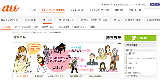 「iPhone 4S」からは、標準ブラウザ「Safari」のブックマークにある「auお客様サポート」の「auサービス」から「待ちうた設定メニュー」にアクセスするか、直接URL(http://www.au.kddi.com/machi_uta/index.html)を入力してアクセスする。「Windows Phone IS12T」からは直接URLにアクセスする。