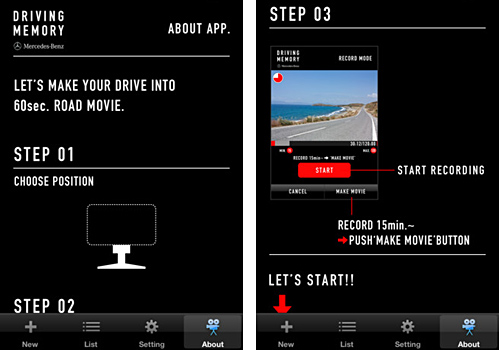 メルセデス・ベンツ日本は、3月15日、オリジナルのドライビングムービーを作成するiPhone用の無料アプリ「DRIVING MEMORY」の提供をApp Storeで開始した。