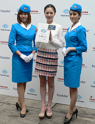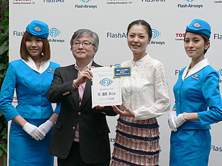 3月22日に「Eco Farm Cafe632」で開催したプレス向けイベントでは、冒頭、東芝セミコンダクター&ストレージ社メモリ事業部・フラッシュメモリ戦略事業部の中井弘人部長が、「Flash Airways」の機長姿で登場。「デジタルカメラが高性能になり、普通のカメラで誰でも簡単に高精細な撮影ができるようになった。こうしたなかで、今後は、撮った写真をみんなでシェアしたいというニーズが高まっていくとみている」と、無線LAN機能搭載のSDHCメモリカード「FlashAir」の開発背景を説明した。さらに、「『FlashAir』は、新しいフォトコミュニケーションの可能性をもっている。写真を共有する感動を広めていきたい」と抱負を語った。