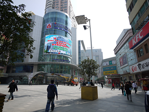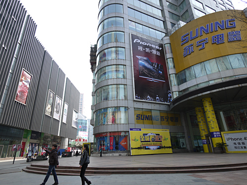 新街口の入り口にある中国最大の家電量販店チェーンの蘇寧電器。このほか、近くもう1店舗ある(3月21日撮影)