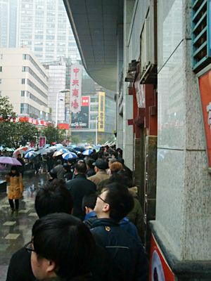 【南京発】ヤマダ電機は、3月22日、中国江蘇省南京市白下区洪武路に南京店をオープンした。朝から降り続く雨のなか、開店セールを目当てに数百人が行列。9時ちょうどの開店直後、われ先にと入店しようとする客で10分程度の混乱はあったが、その後はスムーズに客が次々と入店していった。ヤマダ電機の中国での展開は、2010年12月の瀋陽店、2011年6月の天津店に続き3店舗目。雨の平日ということもあって、オープン時の客の入りはこれまでの2店舗に比べるとやや少なめだった。