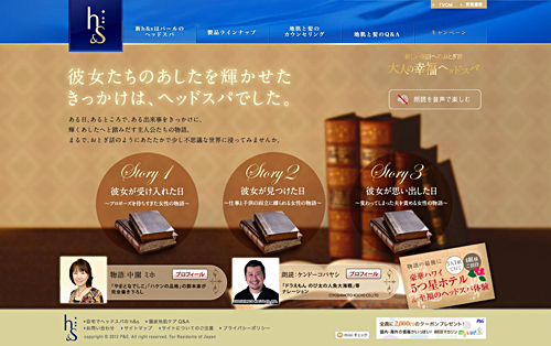 人気ドラマ『ハケンの品格』『やまとなでしこ』などを手がけた脚本家・中園ミホさんの大人の女性が幸せになる「おとぎ話」を、渋い低音で人気のケンドーコバヤシさんが朗読する。物語は、さまざまな悩みをもつ女性たちが、ふと眼の前にあらわれたヘッドスパサロンでの体験をきっかけに、心がときほぐされ、幸せな結末を迎えるというもの。『彼女が受け入れた日』『彼女が見つけた日』『彼女が思い出した日』の全3本で構成する。「h&s」のコンセプトに通じる「ふとした言葉や行動がきっかけになり新しい自分を生み出すことができる」、「内面をケアすることで自然と外見も輝きだす」というメッセージを盛り込んだ。