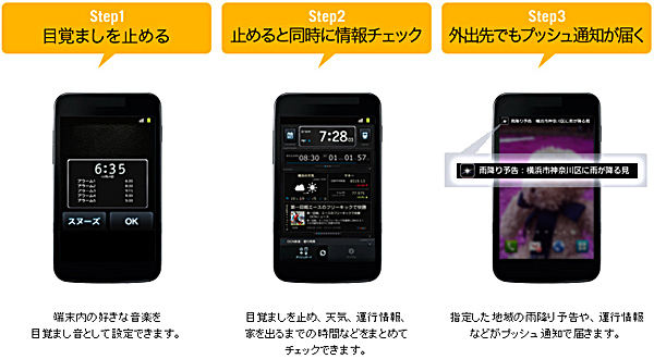 忙しい朝に、目覚まし時計アプリを止めるだけで、天気や列車の運行状況など、毎朝の必要な情報を表示する。カウントダウン機能や、情報のプッシュ通知機能を備える。