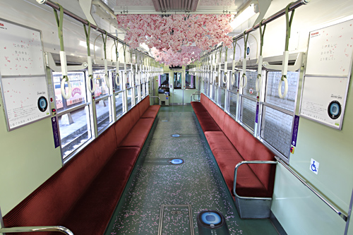今年は「桜電車」に加え、東芝のロボットクリーナー「Smarbo」をアピールする特別車両「お花見電車」が登場。中吊り部分や窓、床面を桜で装飾するなどのデコレーションで「Smarbo」が車内をジャックし、「桜のトンネル」のお花見を演出する。