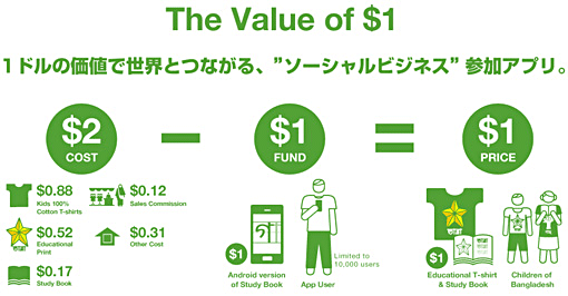 「1ドルの価値で世界とつながる」をコンセプトに、先着1万人分の売り上げをバングラデシュの子どもたちの識字率向上に役立つプリントTシャツと学習ブックレットの生産資金に充てる。売り上げを利用することで、本来ならセットで2ドル相当の商品を1ドル相当の現地価格で、バングラデシュの合弁会社「グラミンユニクロ」を通じて販売する。