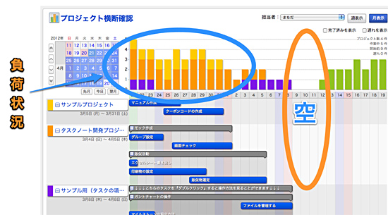 新たに搭載した「プロジェクト横断ビュー」は、プロジェクトを横断して担当者の状況を見ることができる機能。誰が、いつ、どんな仕事を抱えているかを簡単に把握することができ、業務の効率化に役立つ。