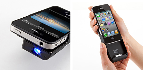 ケースのようにスライドしてiPhoneに装着する。Dockコネクタと接続して、iPhone内のスライドショーや動画の投影をはじめ、YouTube、GoodReader、Keynoteの図や動画を投影できる。明るさは最大12ルーメン。ピントや音量調節は、片手で行うことができる。スクリーンサイズは7~65インチで、解像度は640×360。