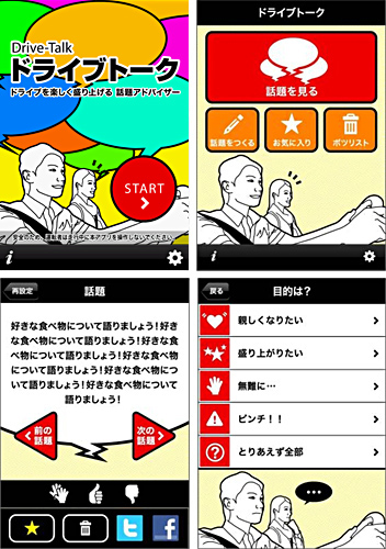 主な機能は、話題を探す人のための「話題を見る」、「話題」を思いついた人のための「話題をつくる」、登録した「話題」を閲覧・編集する「お気に入り」、ボツにした「話題」を復活させる「ボツリスト」の四つ。なお、運転中のドライバーが操作するのは非常に危険なので、ドライブ前にアプリを起動して話題をチェックしておく必要がある。