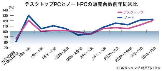 家電量販店の実売データを集計した「BCNランキング」で、今年年初からのPCの週次販売台数をみると、前年を若干下回る週はあるものの、デスクトップPC、ノートPCとも、堅調に販売台数を伸ばしている。これは、上位機種を中心に手頃な価格で購入しやすくなったこと、スマートフォンやタブレット端末のデータバックアップをPCで行うという新しい用途が出てきていることなどが要因だ。ちなみに、昨年の販売台数前年比はデスクトップPCが115.1%、ノートが107.0%だったので、増加傾向は昨年から継続していることになる。