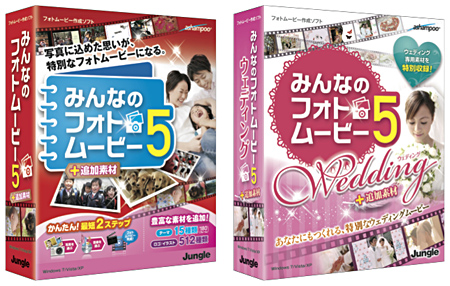 ジャングルは、オリジナルフォトムービー作成ソフト「みんなのフォトムービー5」と「みんなのフォトムービー5 Wedding Edition」の2製品に追加素材を付属した「みんなのフォトムービー5+追加素材」と「みんなのフォトムービー5 Wedding+追加素材」を、4月6日に発売する。