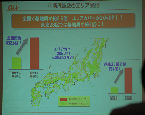 KDDIは、2006年度から周波数再編に向けて新800MHz/2GHzエリアの構築に取り組み、現在、新周波数基地局の数は旧周波数基地局と比較して全国で2.6倍、東京23区で約4倍までに増加している。西山副統括本部長は「エリアカバー率も20%向上した」と説明した。