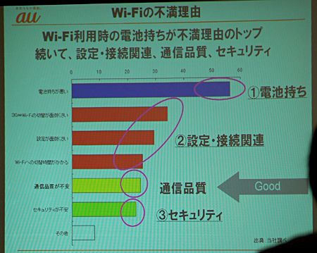 今後は、ユーザーの利便性向上に力を注ぐ。同社の調査によると、Wi-Fiに対してユーザーの不満が最も高いのは「接続時の電池持ち」で、次いで「設定・接続の煩雑さ」が挙がった。