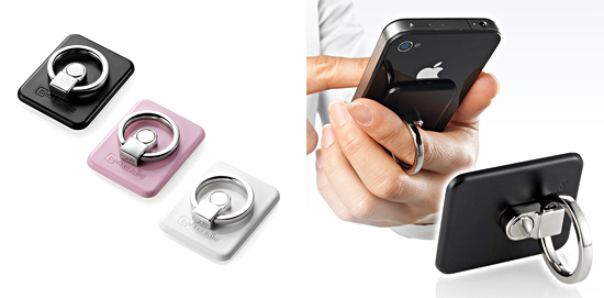 スマートフォンに粘着パッドで装着する指輪型のホルダー。リング部分に指を通してスマートフォンを保持する。リング部分は360°回転し、装着したままで使いやすい角度に調整できる。