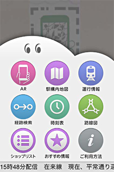 東京駅の柱や床面の27か所に設置したAR識別マーカーをスマートフォンのカメラ越しに認識すると、付近のエキナカ店舗情報や立体的な駅構内地図などが表示される。また、アプリのメニューから運行情報、経路検索、時刻表、駅構内図などの鉄道運行情報と、ショップリストやおすすめ情報などのエキナカ情報がチェックできる。利用者へのアンケートなどを通じて、提供するサービスの内容を評価・検証して、今後の実用化を目指す。