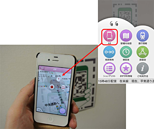 スマートフォンのカメラ越しに駅のARマーカーを見ると、付近のエキナカ店舗情報や立体的な駅構内地図などが表示される