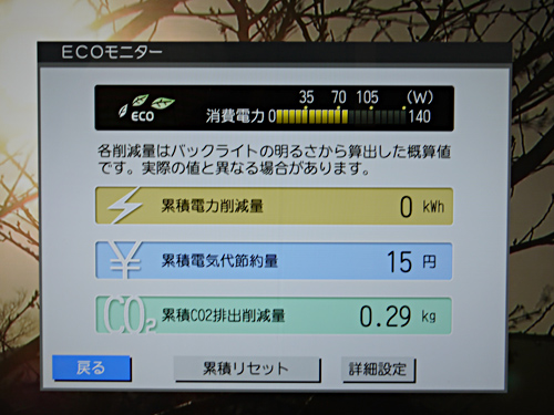 ECO機能は、消費電力や累積電力削減量など、節約できた電気削減量や電気料金などがひと目でわかる機能。効果を実感しやすいので、エコ活動も継続しやすい。